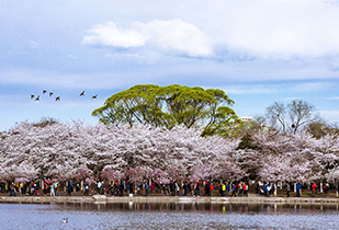 在水一方:园内目前体量较大的一株吉野类樱花,独立湖畔丰姿绰约。她横生的花枝舒展秀丽,像热情开张的臂膀。她与春水相映而成的画面,已成为公园樱花的代表景致,也成为游人争相合影的佳处。  详情>>